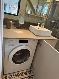 Here you’ll find the washer-dryer, a drying rack to the right of it, clothespins in the cabinet under the sink and washing products under the cabinet (use a capsule and an anti-limescale product, taking care to remove the paper).